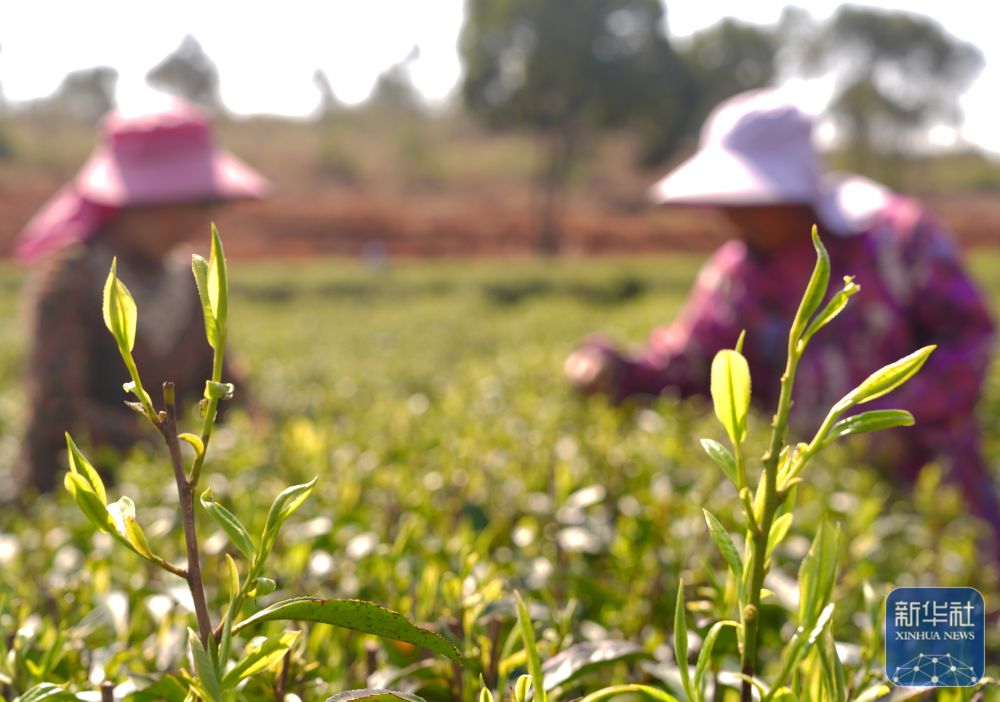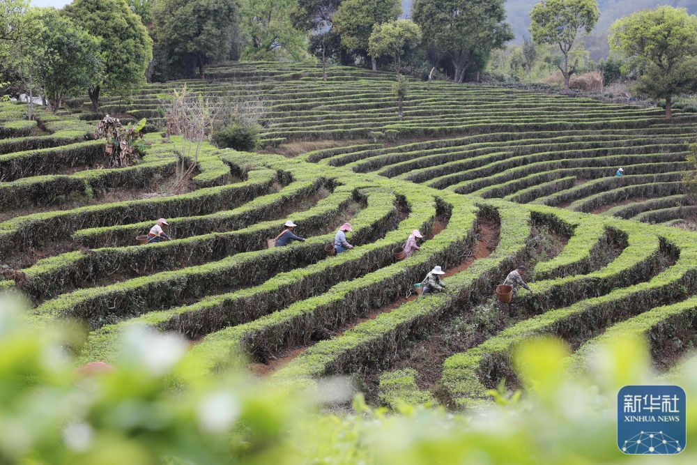 ↑ 3月12日,茶农在云南省普洱市宁洱哈尼族彝族自治县宁洱镇温泉村茶园采摘春茶。新华社发(杨廷荣 摄)