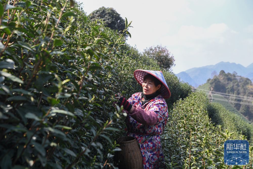 ↑ 3月12日,在重庆市秀山土家族苗族自治县梅江镇兴隆坳现代农业园区茶叶示范基地,一名采茶工人在采摘春茶。新华社发(胡程摄)