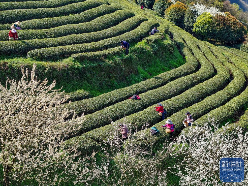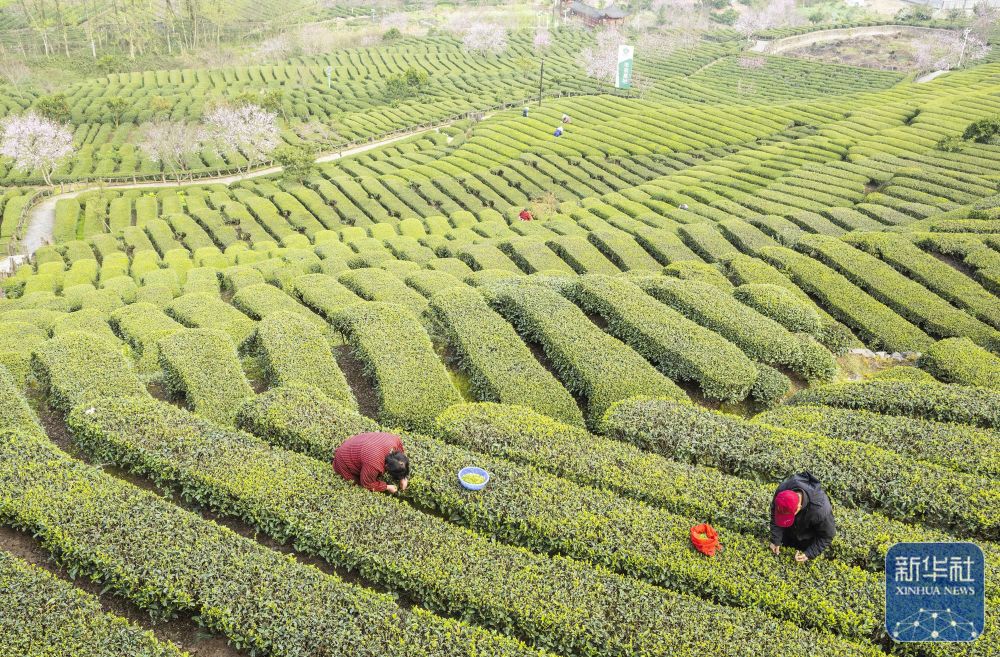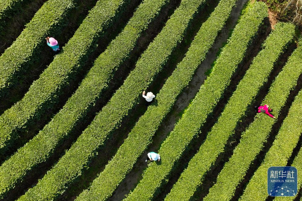 ↑ 3月12日,茶农在贵州省开阳县南龙乡田坎村茶园采摘春茶(无人机照片)。新华社发(袁福洪 摄)