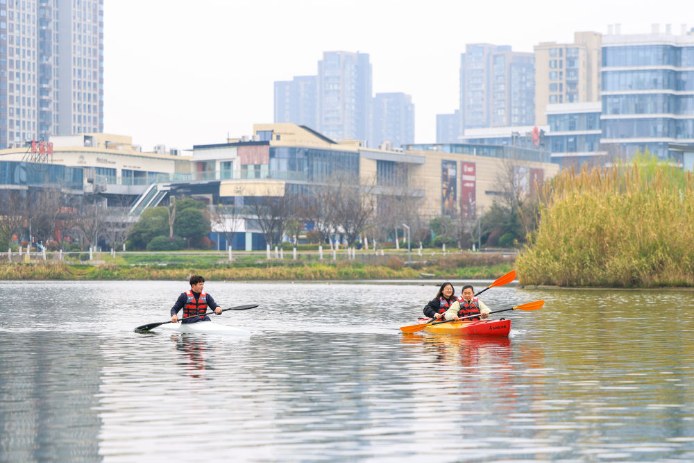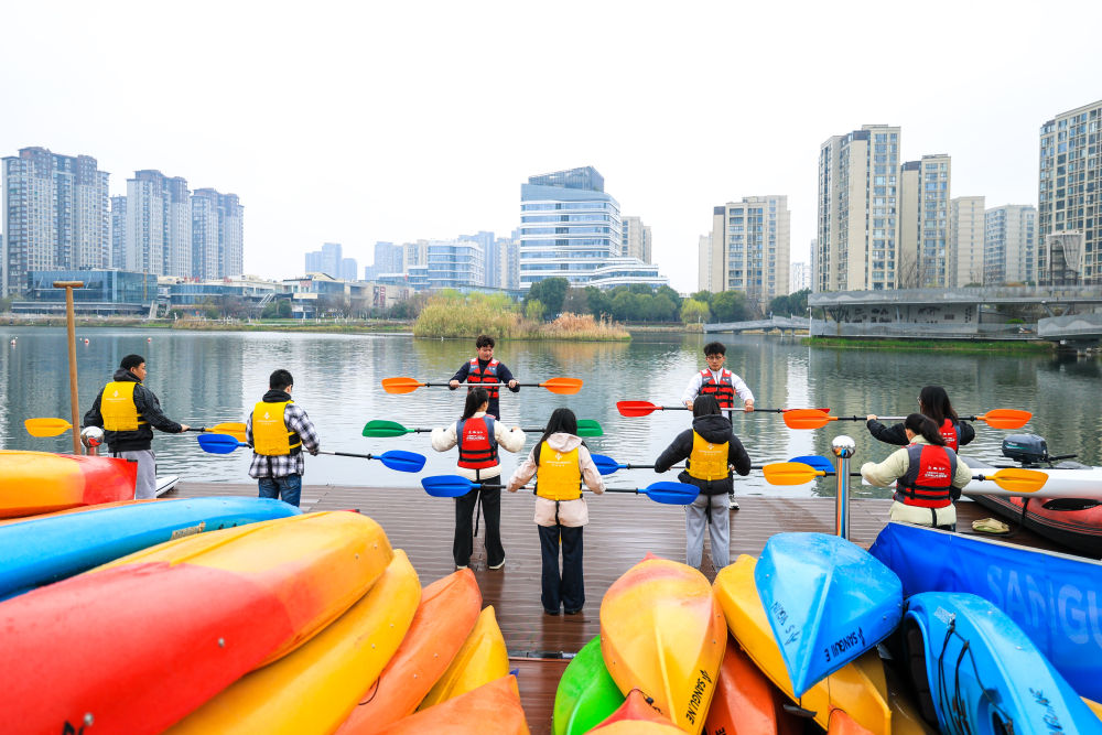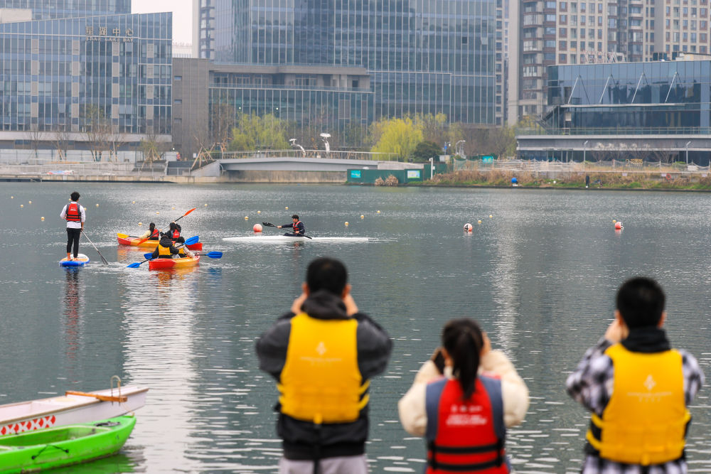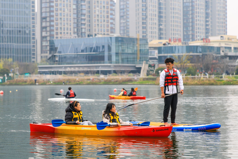 早春时节,一堂水上运动公开课在浙江省宁波市江北区甬江街道星湖公园进行。青年学员们划着皮划艇、桨板,在教练员指导下泛舟湖面,享受水上运动的乐趣。
