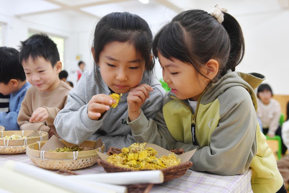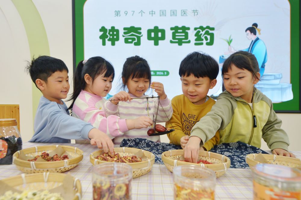 ↑3月17日,在山东省青岛市市北区桦川路幼儿园开展的“神奇中草药”主题活动上,小朋友们学习辨识中药材。新华社发(王海滨摄)