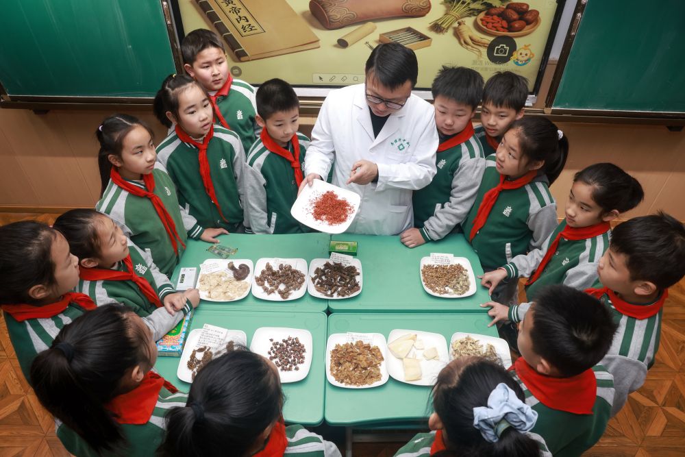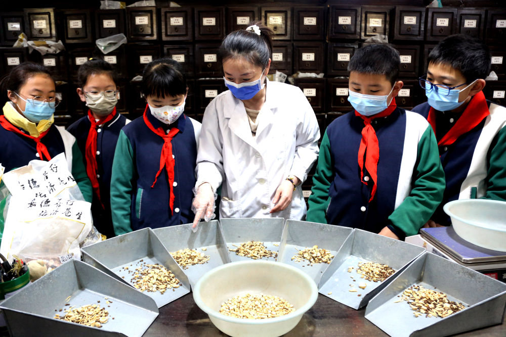 ↑3月17日,在江苏省连云港市连云区一中医馆,医务人员为学生讲解中草药的功效。新华社发(王春摄)