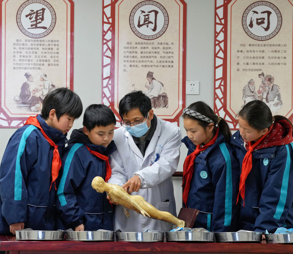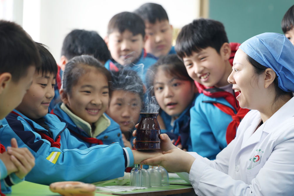 ↑3月17日,在山东省临沂市郯城县第二实验小学,郯城街道卫生院的医师为小学生讲解中医艾灸知识。新华社发(张春雷摄)