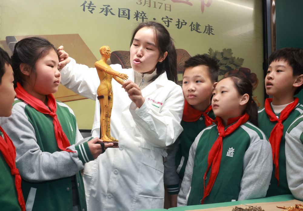 ↑3月17日,在湖北省武汉市未来实验小学美林校区,国医馆医师为学生科普针灸穴位知识。新华社发(赵军摄)