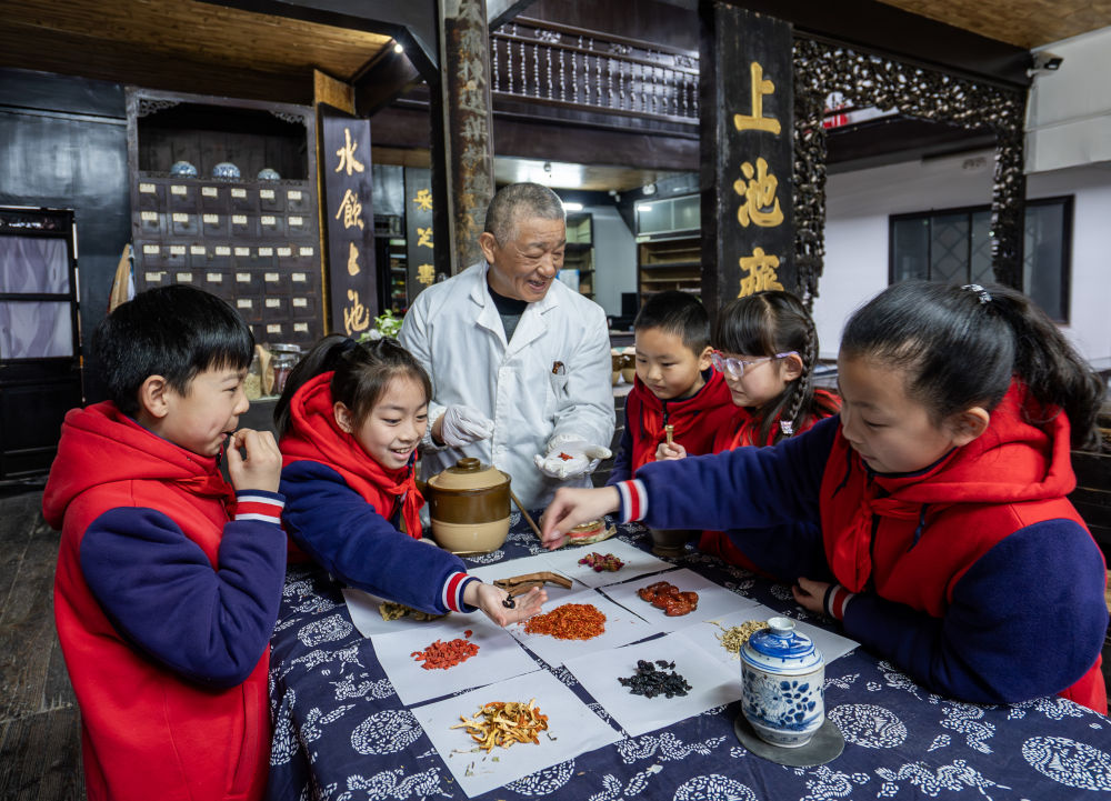 ↑3月17日,在江苏省兴化市昭阳街道上池斋药店,兴化市景范学校学生在中药师的指导下学习中草药知识。新华社发(周社根摄)
