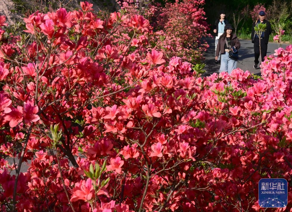 4月23日,游客在河南省汝阳县西泰山欣赏盛开的杜鹃花。新华社发(高山岳 摄)