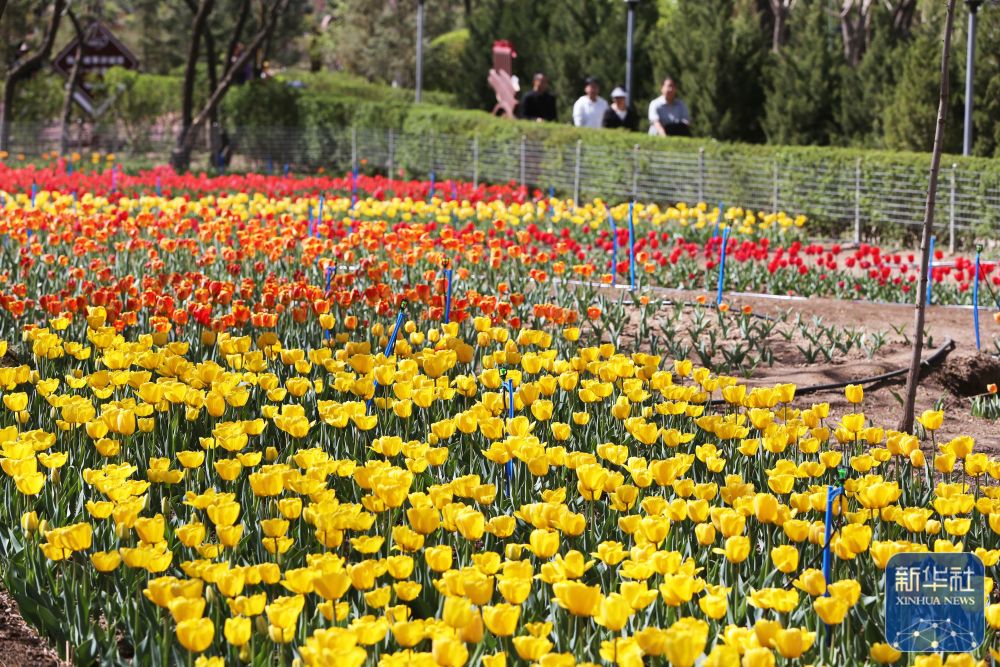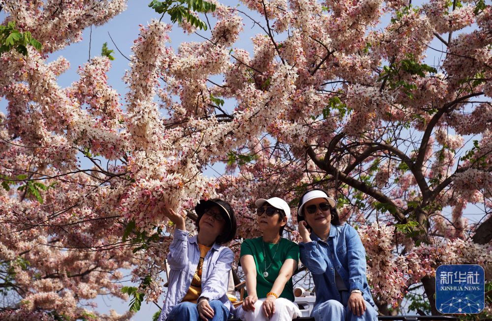 4月25日,市民在甘肃省定西市安定区一处公园内赏花游玩。新华社发(王克贤 摄)