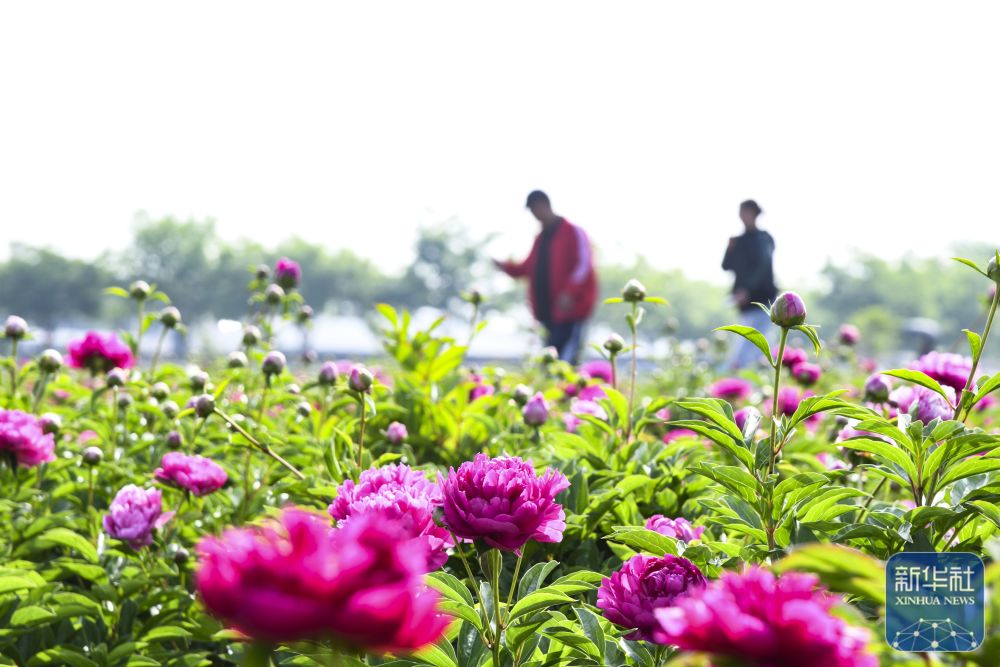 4月25日,游客在河南省济源市梨林镇后荣村芍药种植基地赏花游玩。新华社发(苗秋闹摄 )
