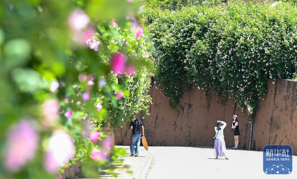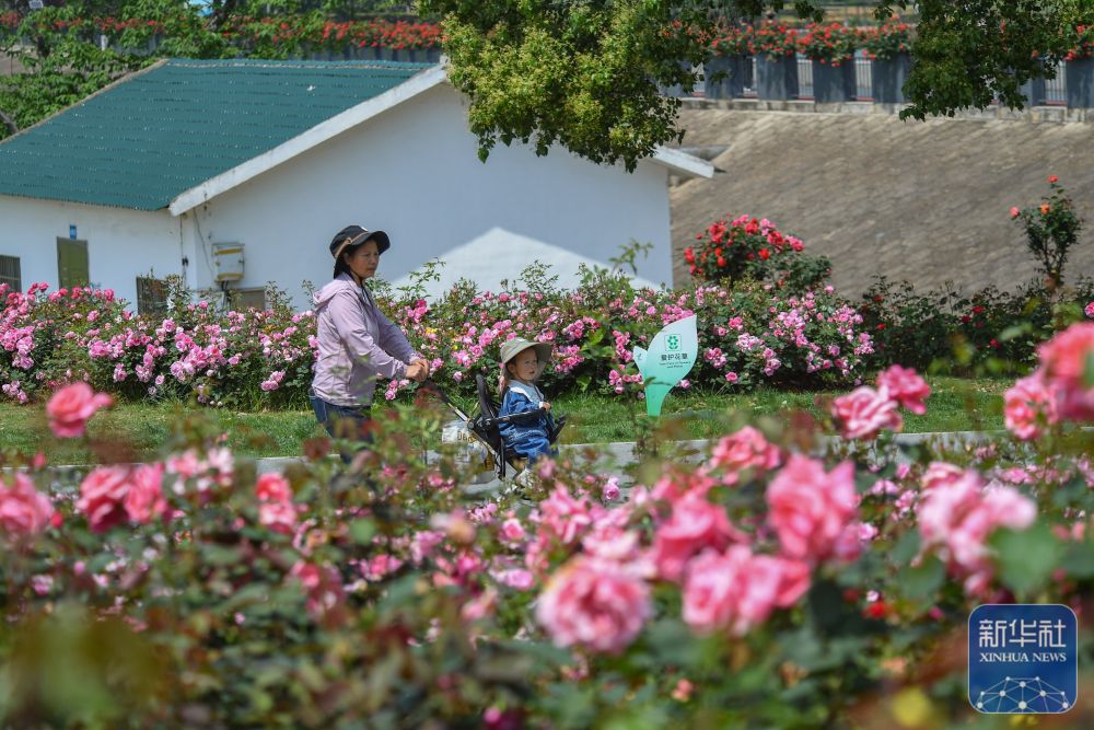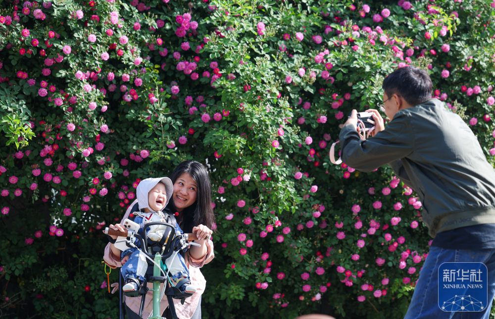 4月24日,市民在河北省石家庄市一处蔷薇花墙前赏花拍照,乐享亲子时光。新华社发(梁子栋 摄)