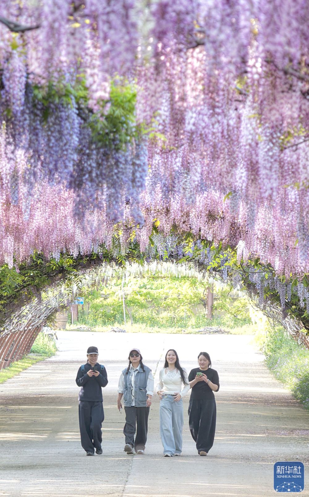 4月24日,人们在江苏南通洲际梦幻岛紫藤花谷欣赏盛开的紫藤花。新华社发(许丛军 摄)