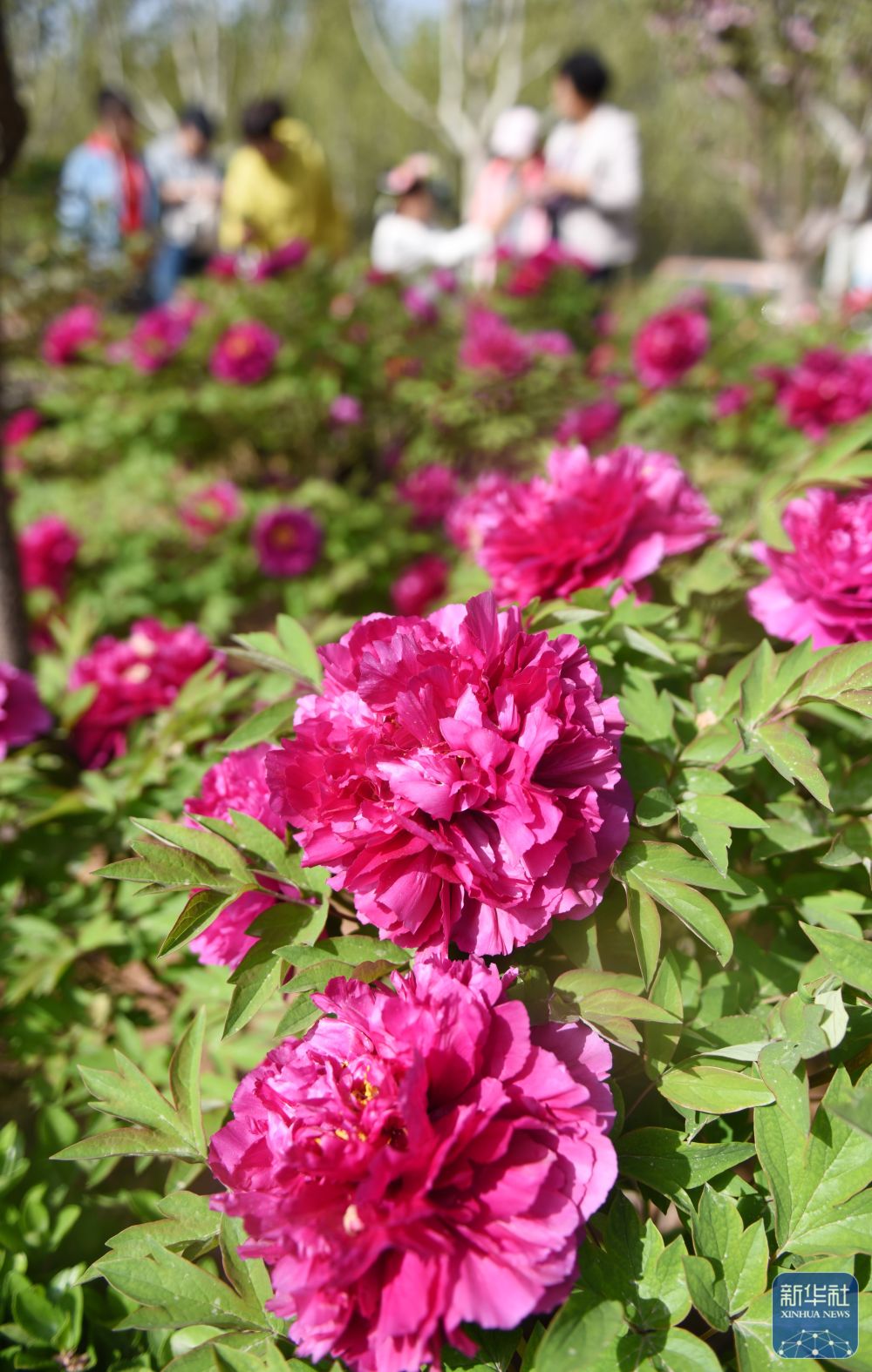 4月24日,人们在甘肃省永靖县刘家峡镇黄河花堤牡丹园里赏花游览。新华社发(史有东 摄)