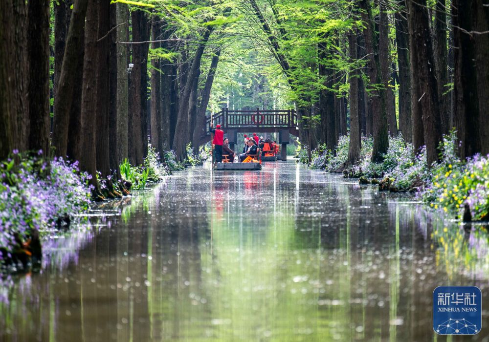 4月23日,游客乘船在江苏省兴化市李中水上森林公园赏花游玩。新华社发(杨玉岗 摄)