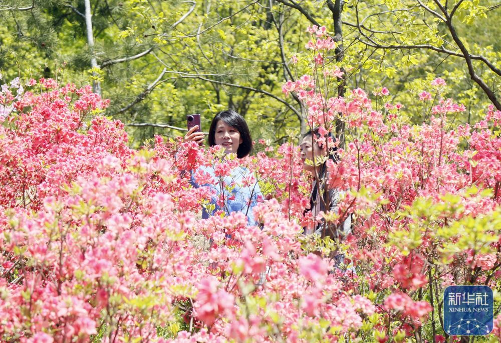 4月25日,游客在河南省洛阳市汝阳县西泰山风景区杜鹃花丛中拍照。新华社发(康红军 摄)