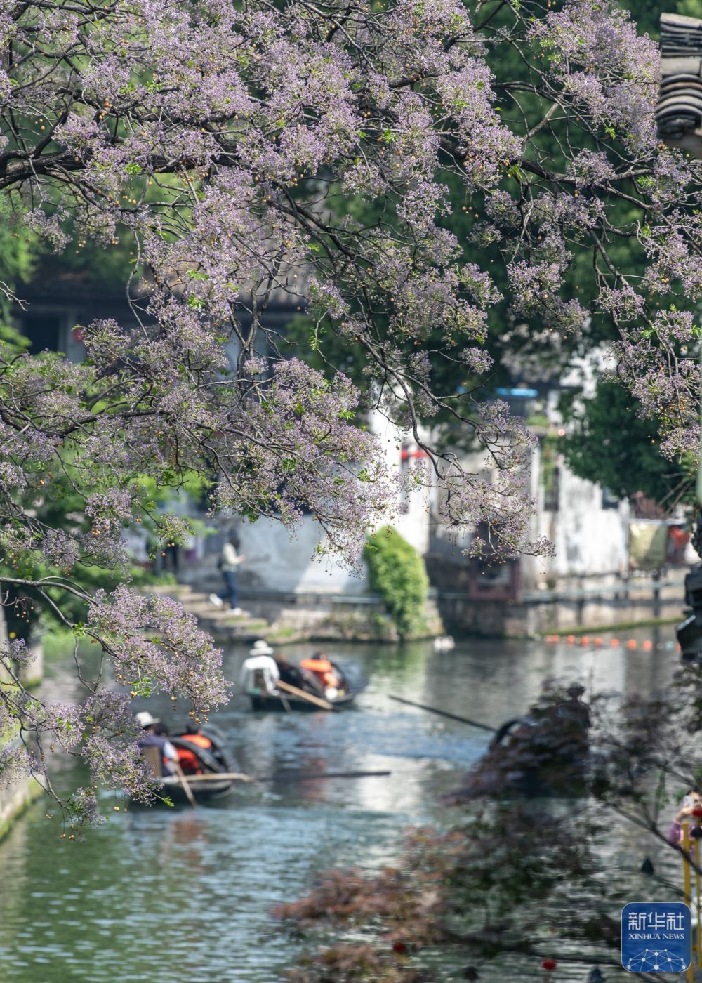 4月25日,游客在浙江省绍兴市越城区仓桥直街乘坐乌篷船游览古城。新华社发(张辉 摄)