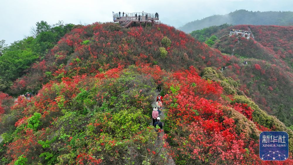 4月24日,人们在江西省萍乡市湘东区广寒寨乡四八门景区内欣赏杜鹃花(无人机照片)。新华社发(李桂东 摄)