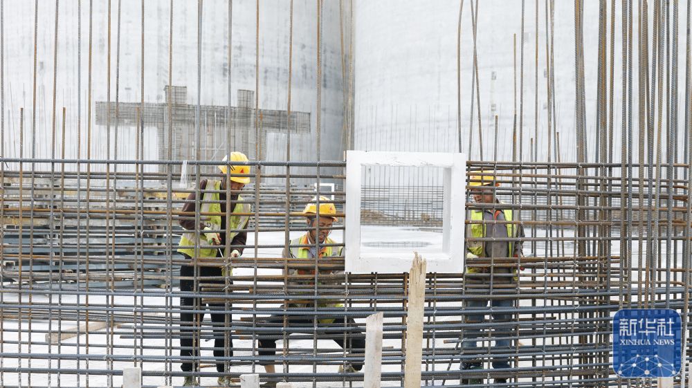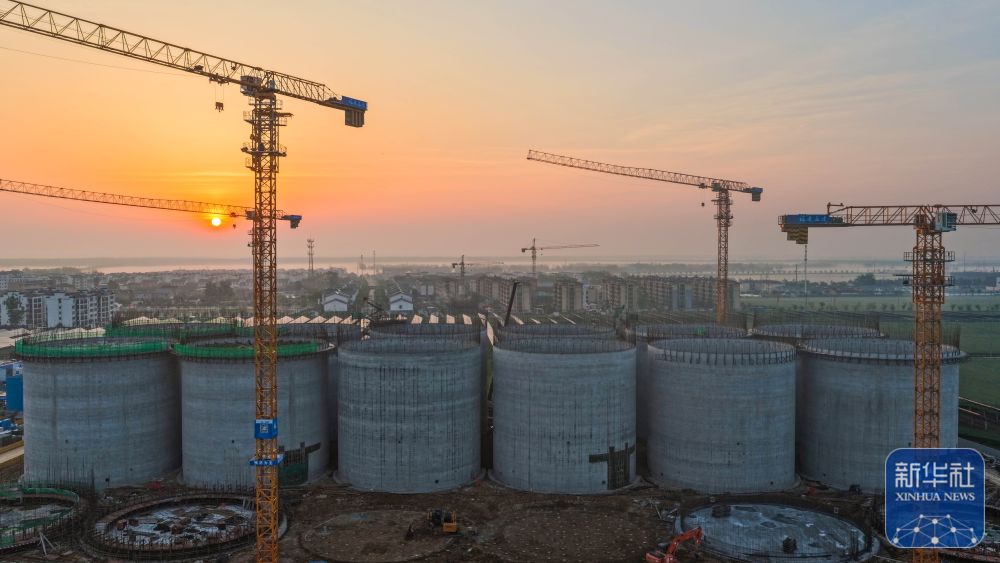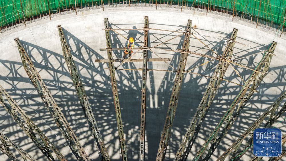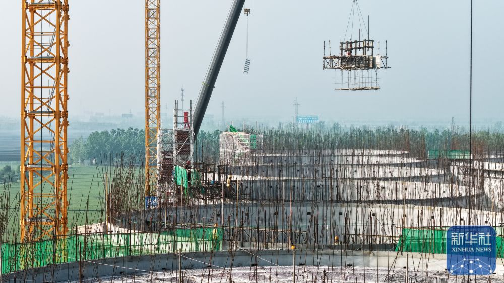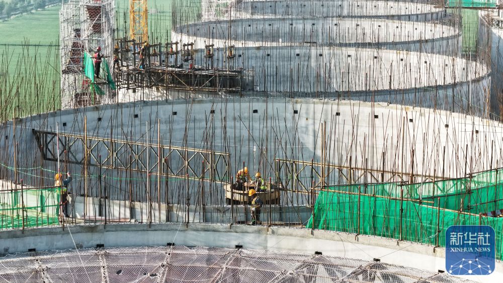 ↑ 4月25日,工人在泗洪县归仁镇中央储备粮宿迁直属库仓储项目建设工地紧张施工。新华社发(许昌亮 摄)