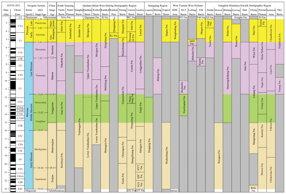 中国的新近纪年代地层系统分为中新统的谢家阶、山旺阶、通古尔阶、灞河阶、保德阶5个阶,以及上新统的高庄阶和麻则沟阶2个阶。研究提出,在青藏高原新生代陆相地层的划分对比和测年标定上,哺乳动物化石起到非常重要的作用。