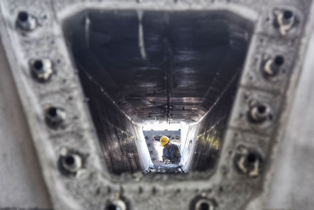 2022年5月6日,建设者在黄茅海跨海通道预制梁场作业。