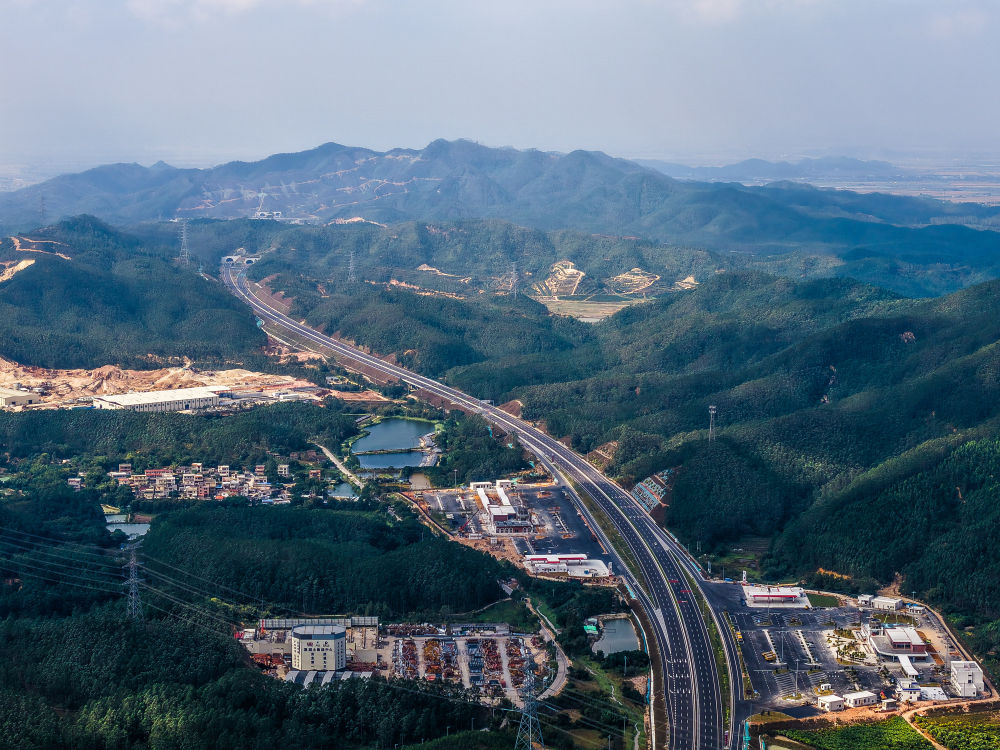 黄茅海跨海通道台山段的黄茅海北服务区和狮山隧道(2024年12月4日摄)。