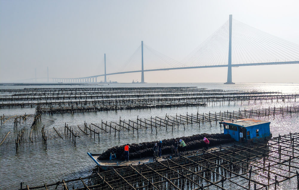 蚝农在黄茅海大桥西侧水域收获国家农产品地理标志产品江门台山蚝(2024年12月7日摄)。