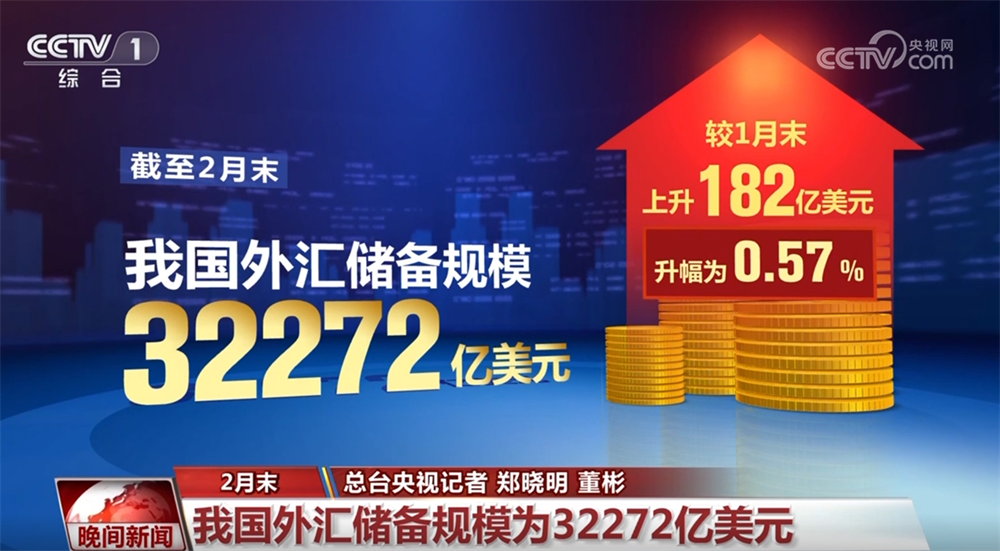 国家外汇管理局最新数据显示,截至2月末,我国外汇储备规模为32272亿美元,较1月末上升182亿美元,升幅为0.57%,外汇储备规模保持基本稳定。