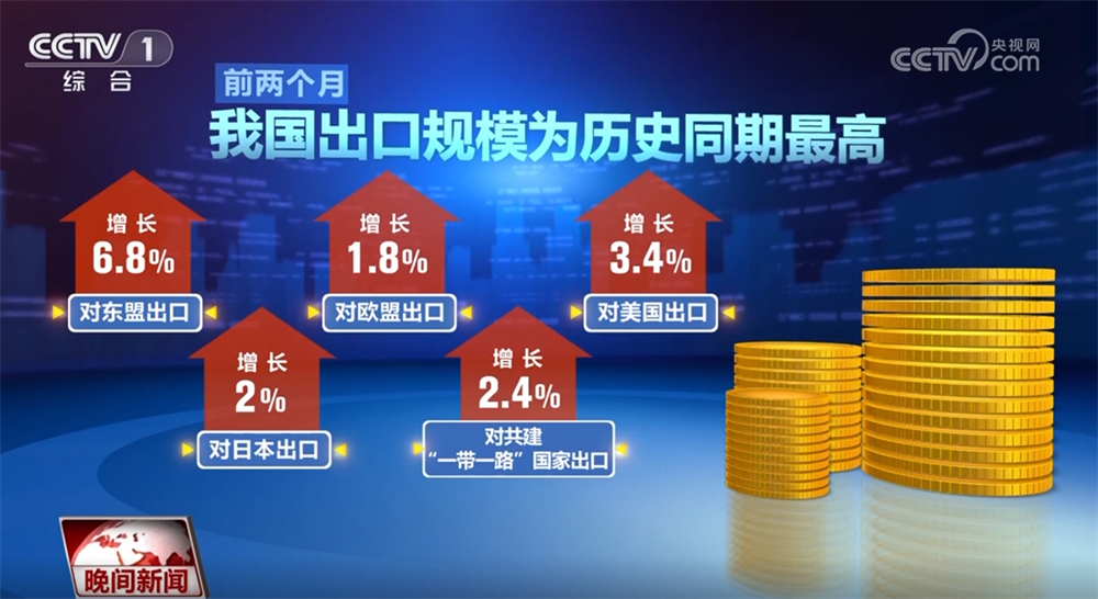 海关总署3月7日发布,据海关统计,今年前两个月,我国货物贸易进出口总值6.54万亿元。其中出口3.88万亿元,增长3.4%;进口2.66万亿元,下降7.3%。前两个月,我国出口规模为历史同期最高。其中,对东盟、欧盟、美国、日本出口分别增长6.8%、1.8%、3.4%、2%,对共建“一带一路”国家出口增长2.4%。