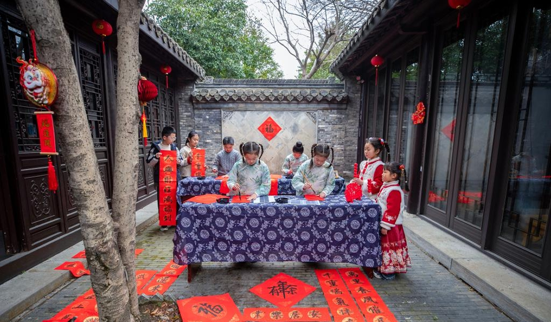 3月13日,游人在陕西省西安市长安区长安唐村景区拍照游玩(无人机照片)。新华社记者 邵瑞 摄