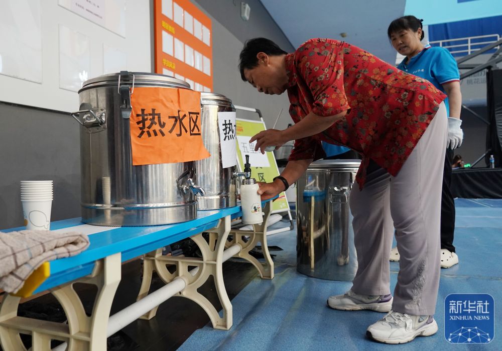 ↑ 7月29日,村民在北京市平谷区体育中心安置点接热水。