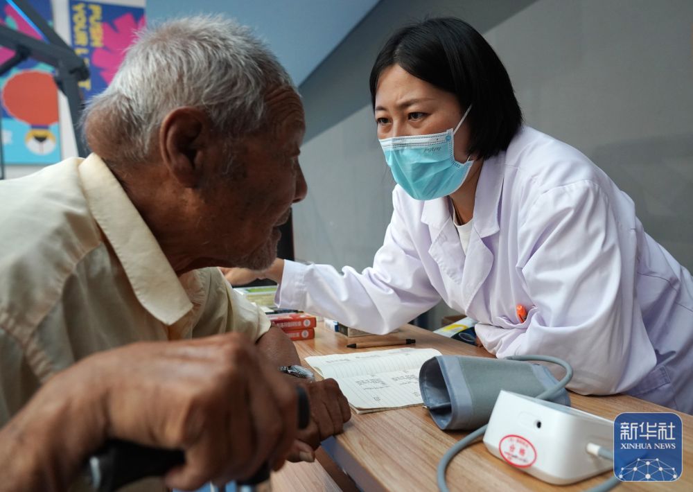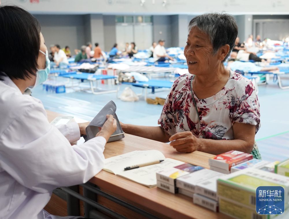 ↑ 7月29日,在北京市平谷区体育中心安置点,来自大兴庄镇社区卫生服务中心的医务人员为老人提供医疗帮助。
