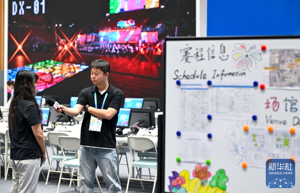 ↑ 媒体记者(右)在成都世运会主媒体中心媒体工作间采访。新华社记者 冯开华 摄