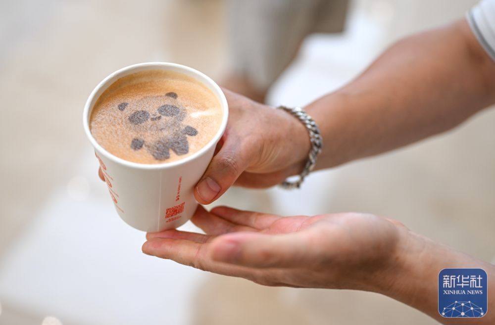 ↑ 一名媒体记者在成都世运会主媒体中心展示由咖啡机器人制作的带有吉祥物“蜀宝”图案的饮品。新华社记者 贝赫 摄