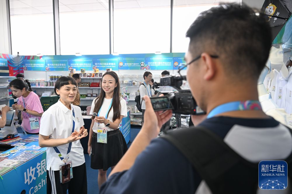 ↑ 媒体记者在成都世运会主媒体中心官方特许商品零售店采访工作人员。新华社记者 贝赫 摄