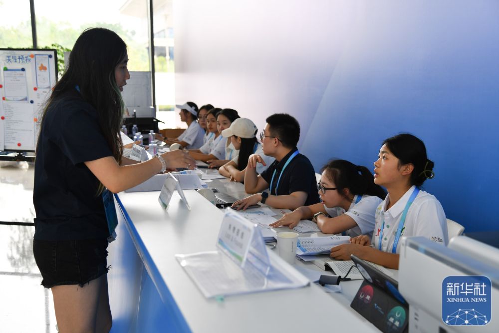 ↑ 志愿者(右一)在成都世运会主媒体中心提供信息咨询服务。新华社记者 张博文 摄