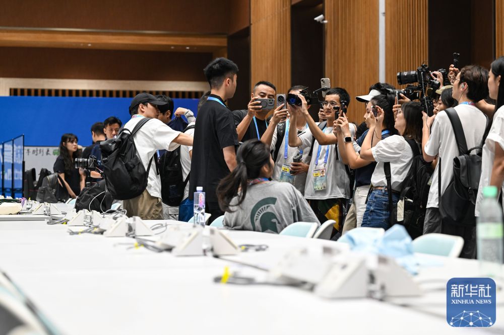 ↑ 媒体记者在成都世运会主媒体中心媒体工作间采访拍摄。新华社记者 冯开华 摄