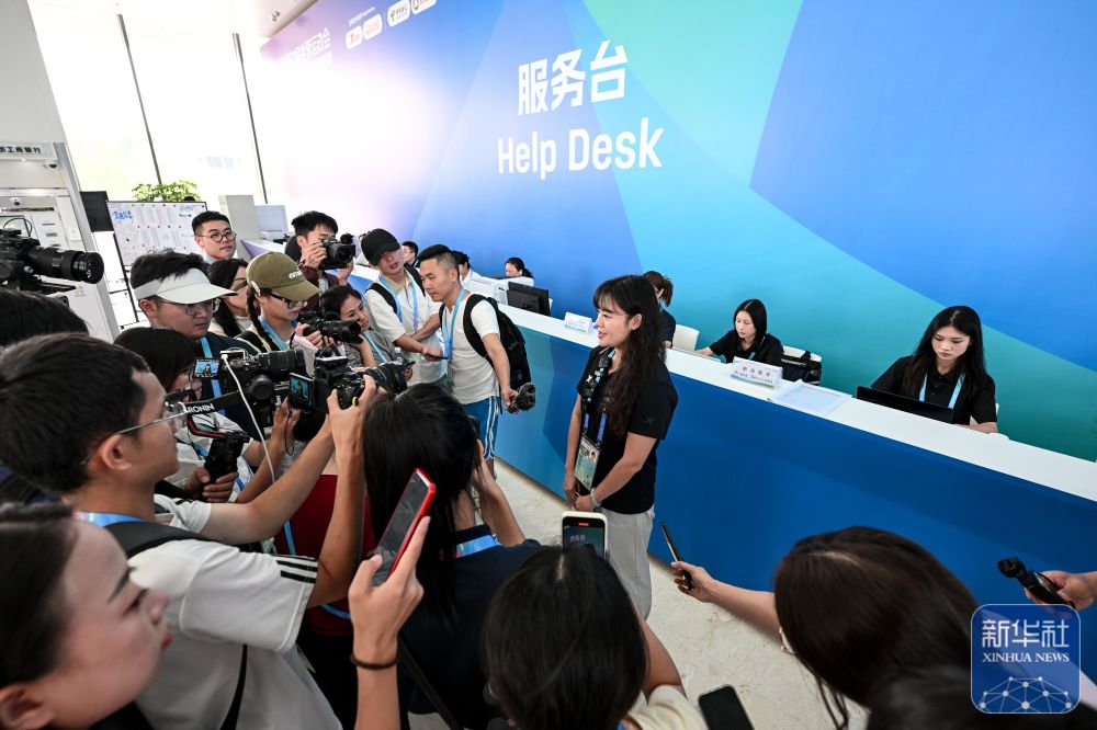 ↑ 媒体记者在成都世运会主媒体中心服务台前采访拍摄。新华社记者 冯开华 摄