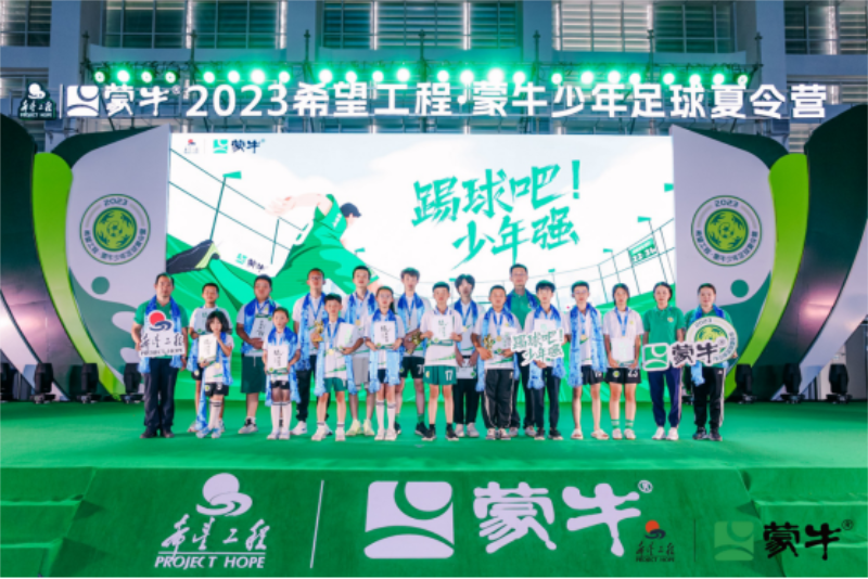 与此同时,蒙牛集团还积极承担民族企业责任,在公益道路上不断前行。自2002 年起,蒙牛学生饮用奶启动 “ 牛奶助学行动 ”,随后发起“每天一斤奶,强壮中国人” 等饮奶普及活动,并逐步升级为“蒙牛营养普惠工程”,同步启动“学生体质改善计划”及“敲铃人·村小校长赋能计划”。 2022 年起,蒙牛学生奶发起“ 希望工程 · 蒙牛少年足球公益行 ”活动, 从公益的角度发挥体育的独特育人功能。