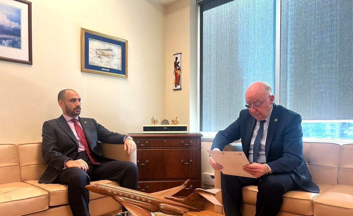 △卡塔尔常驻国际民用航空组织代表阿卜杜拉·马尔基(左)20日向国际民航组织理事会主席夏基塔诺递交信函