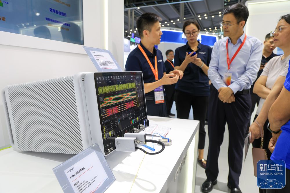 ↑ 10月15日,参观者在万里眼公司展台了解新一代超高速实时示波器。