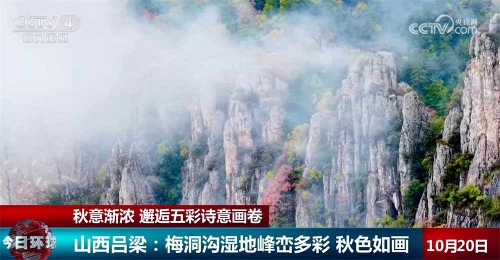 位于山西吕梁方山县的梅洞沟省级湿地公园,最近秋景也进入最佳观赏期,红艳的枫叶、金黄的桦树与苍翠的松针相互交织,阳光透过云层洒下,为彩林镀上一层柔光。