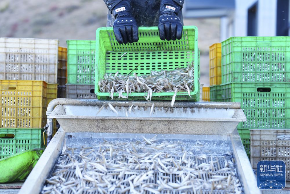 ↑ 10月18日,在青海省海南藏族自治州共和县龙羊新村龙羊峡海湖渔业捕捞合作社,工人收拾新捕的小银鱼。