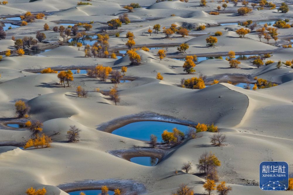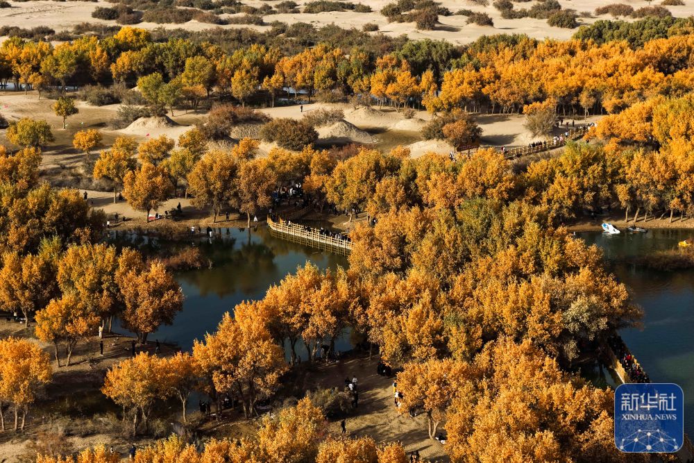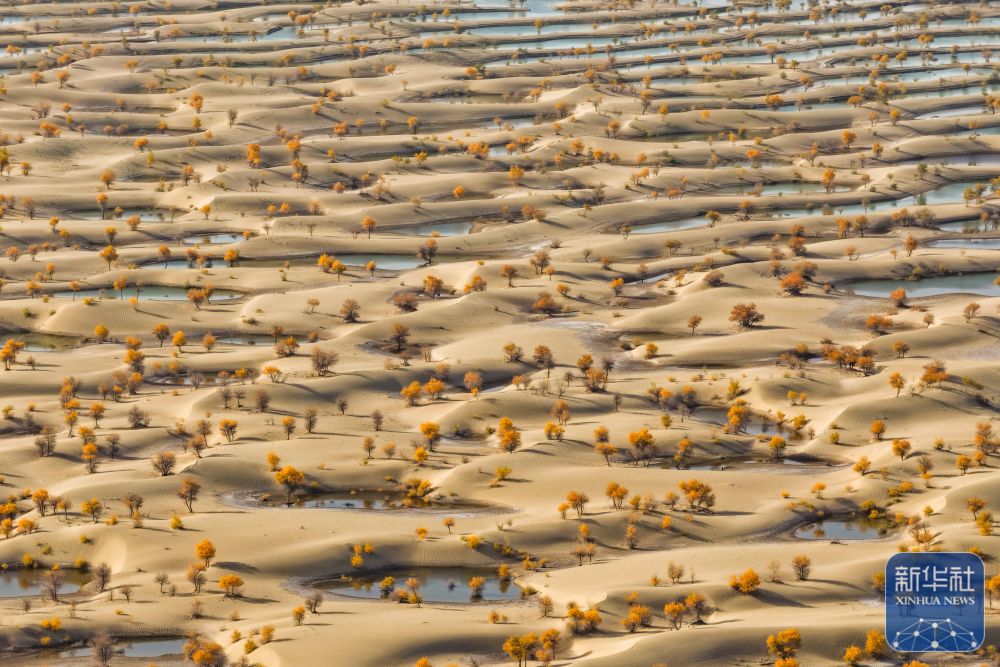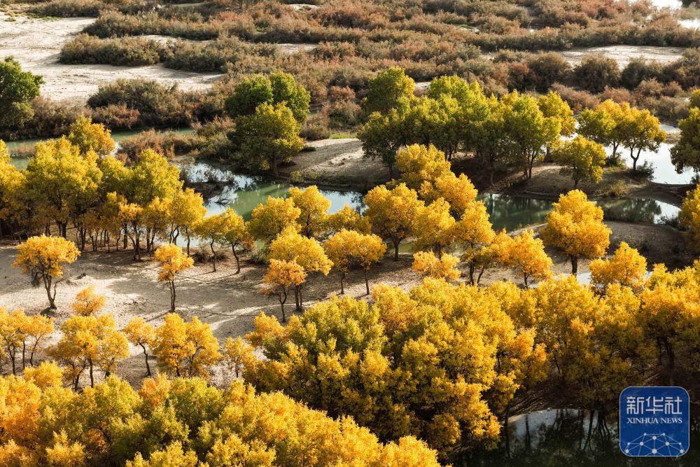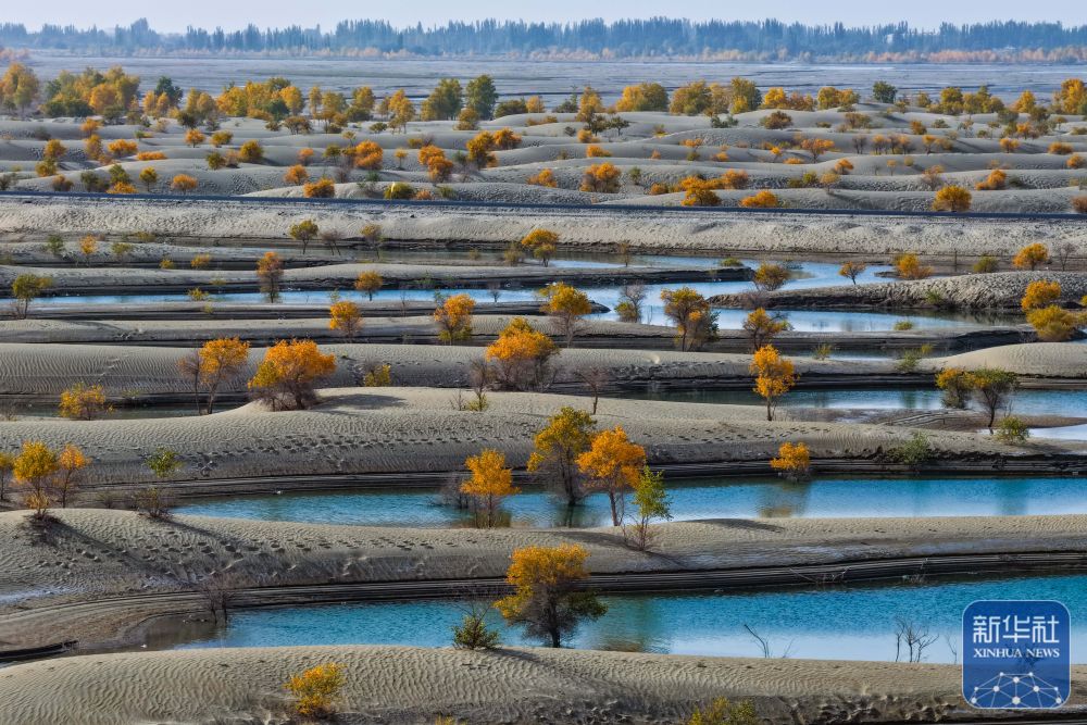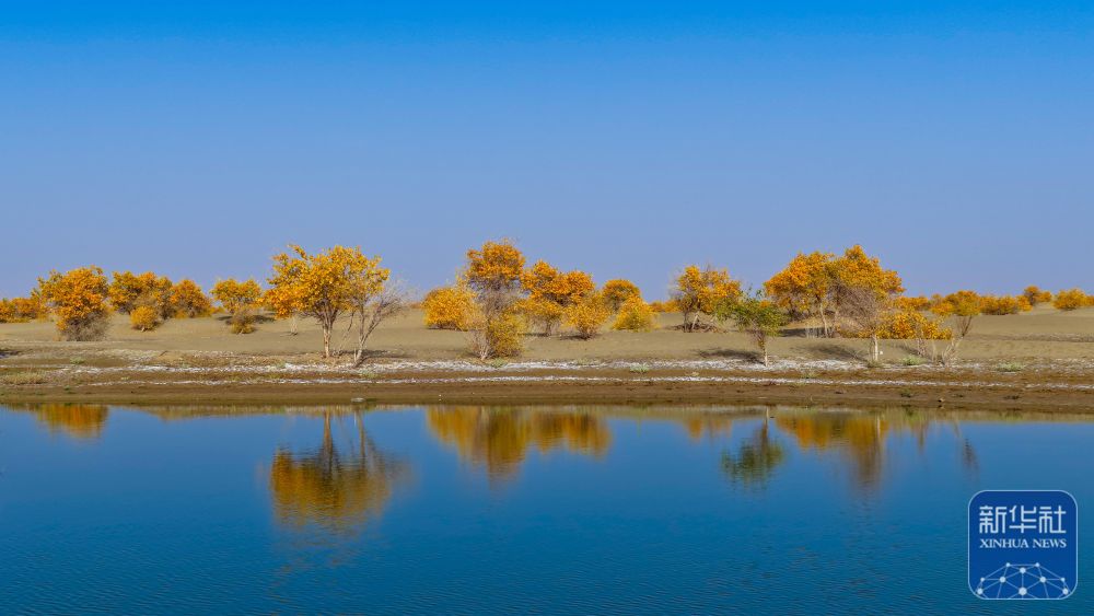 时下,新疆和田地区的胡杨迎来最佳观赏期,成片换妆的胡杨林与水天相映,共绘金秋美景。  新华社记者 辛悦卫 摄