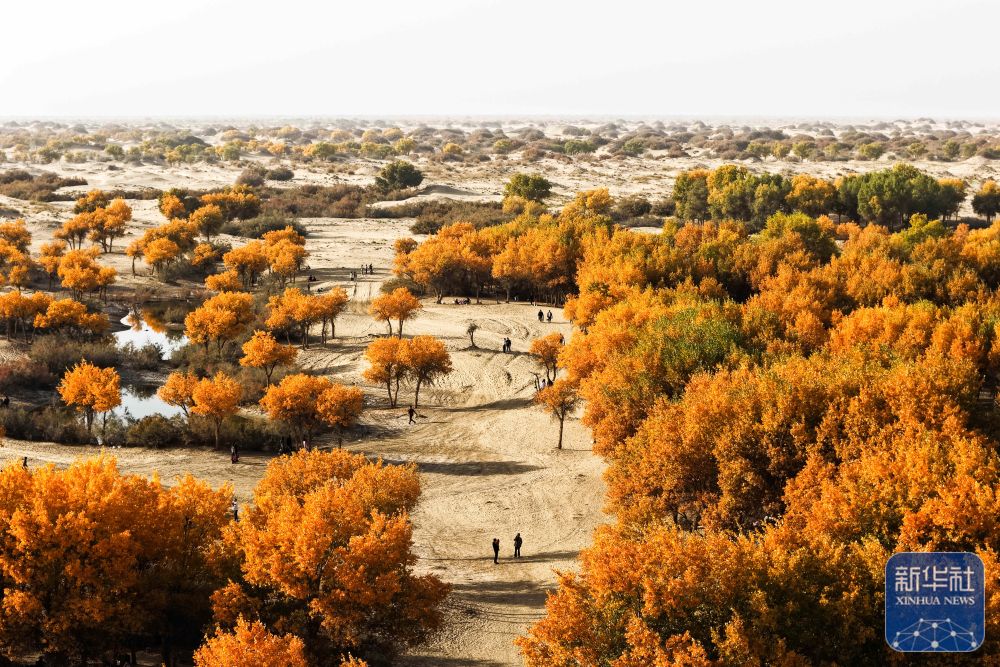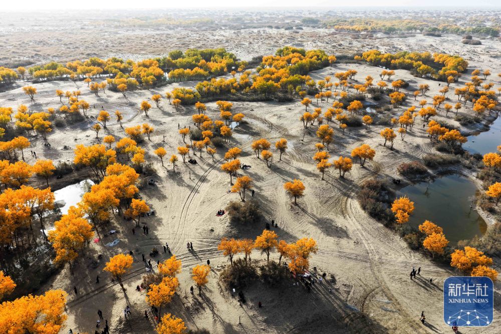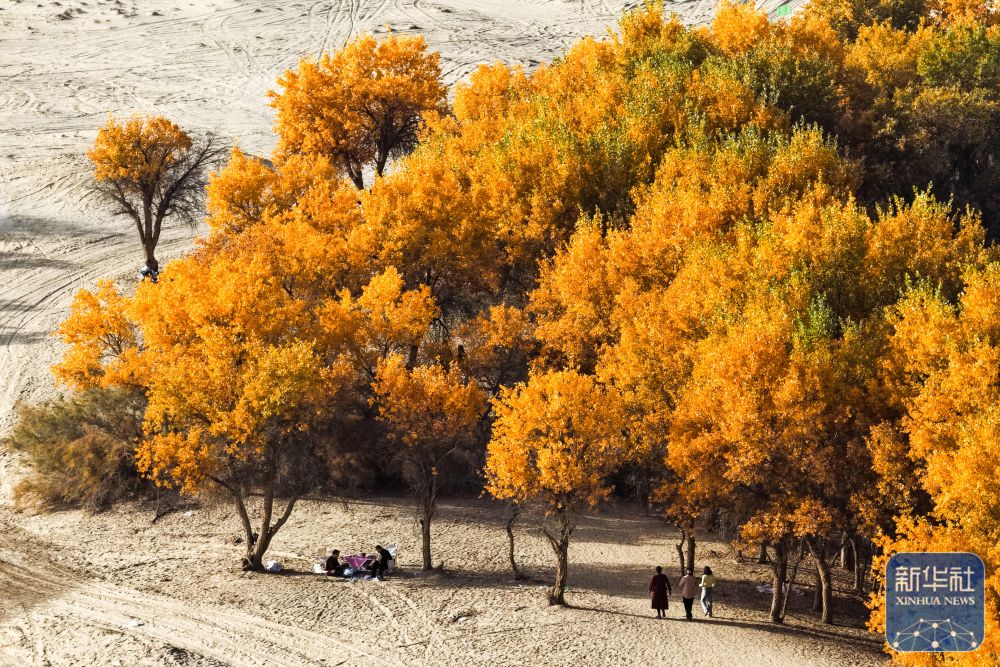 游客在新疆和田地区洛浦县洛滨胡杨林景区游览(无人机照片,10月19日摄)。