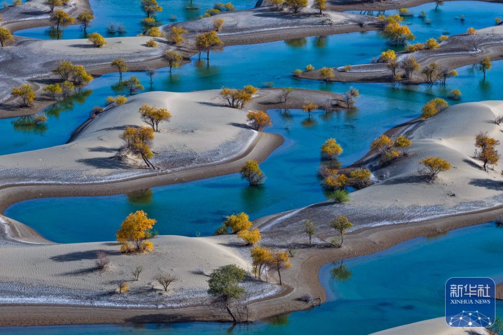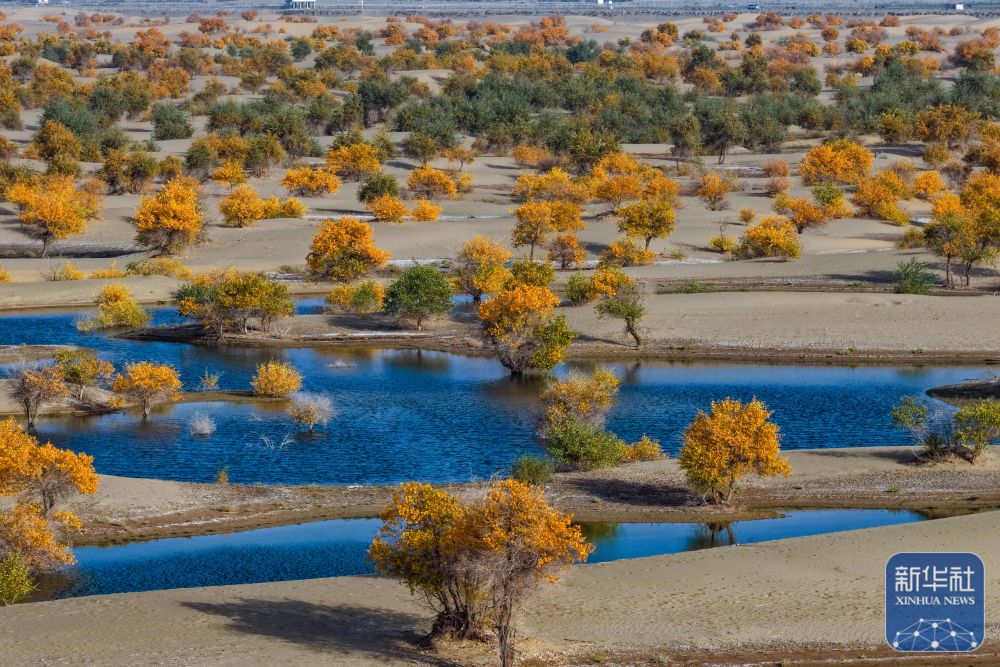 在新疆和田地区和田县翡翠湖,成片胡杨林坐落其中(无人机照片,10月20日摄)。