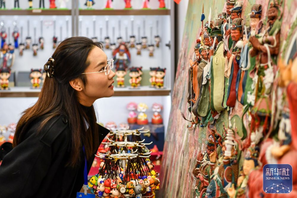 ↑ 10月21日,游客在忻州古城参观非遗面塑作品。