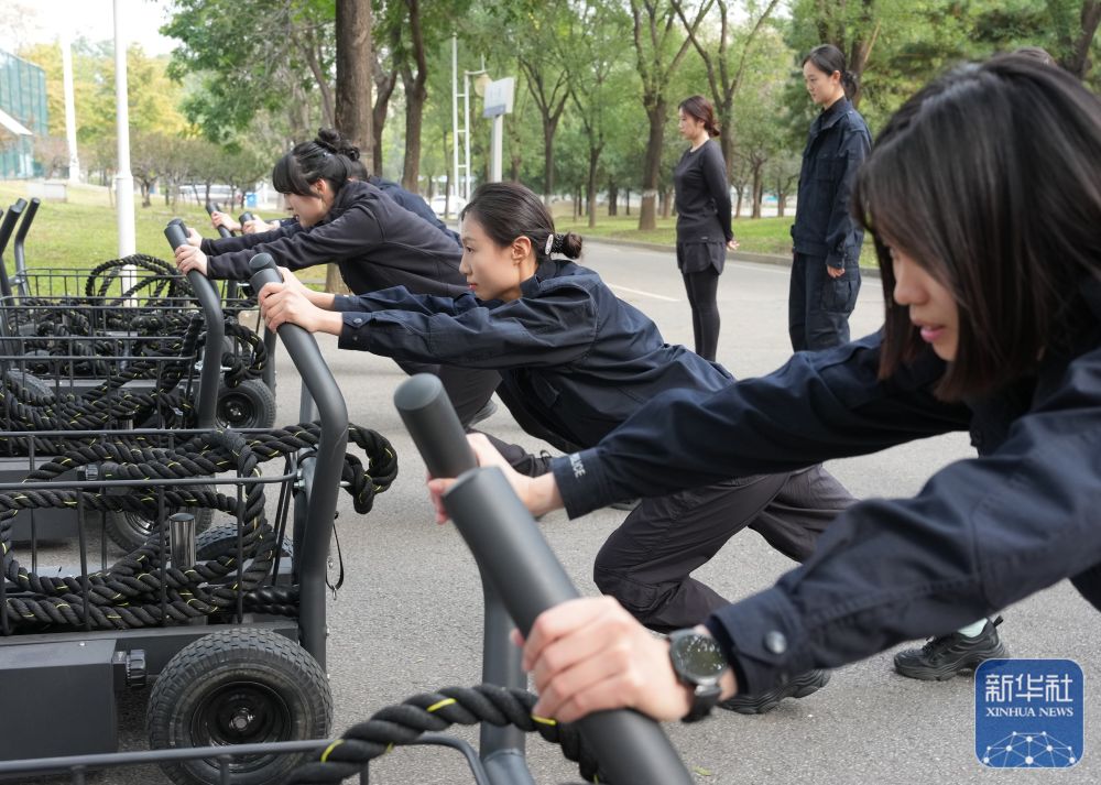 ↑ 10月23日,参训女刑警在进行“负重坦克车推拉”训练。新华社记者 殷刚 摄