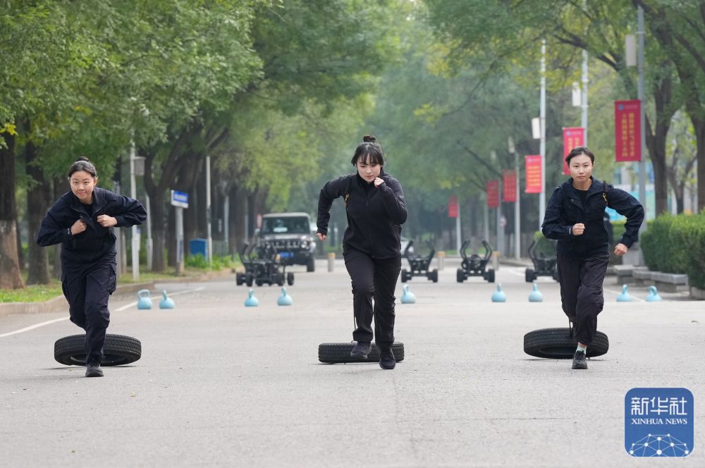 ↑ 10月23日,参训女刑警在进行负重跑步训练。新华社记者 殷刚 摄