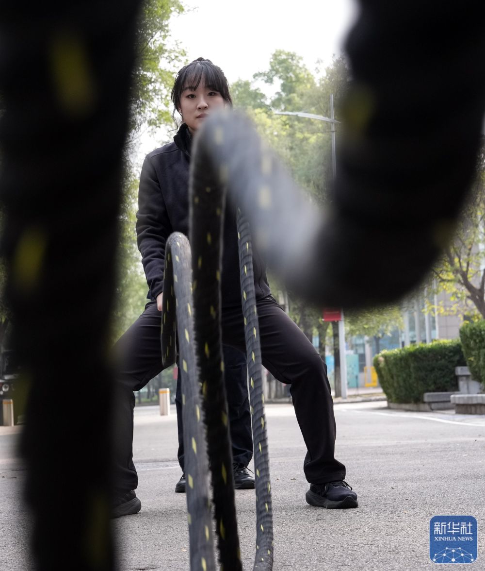 ↑ 10月23日,参训女刑警在进行“战绳”上肢力量训练。新华社记者 殷刚 摄
