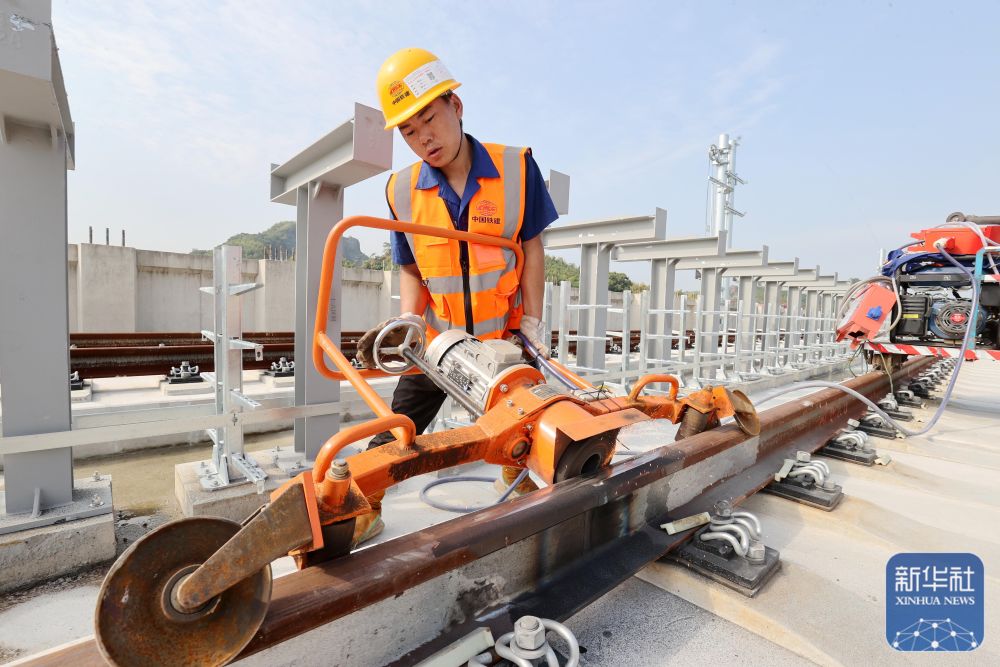 ↑ 11月2日,中铁十一局工人在焊轨段打磨钢轨焊接处。