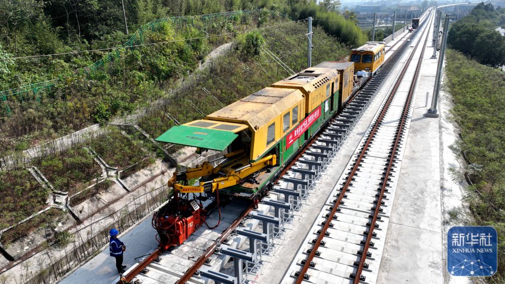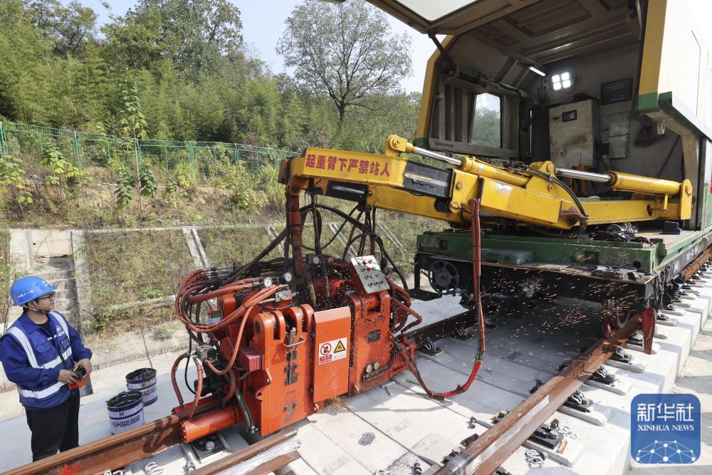11月2日,位于浙江省湖州市德清县下渚湖街道的杭德市域铁路三里塘基地,中铁十一局工人操作新能源焊轨设备进行钢轨焊接作业。