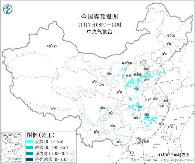 中央气象台今天(11月7日)06时继续发布大雾黄色预警:预计,7日早晨至上午,河北南部、河南中北部、山东北部和东部、山西南部、湖北南部、江西中部、福建西北部等地的部分地区有大雾,其中,山东东部、江西中西部、福建西北部等地的部分地区有能见度不足500米的浓雾,局地有能见度不足200米的强浓雾。